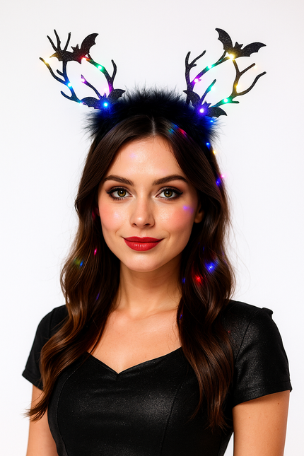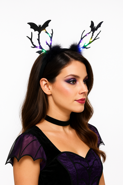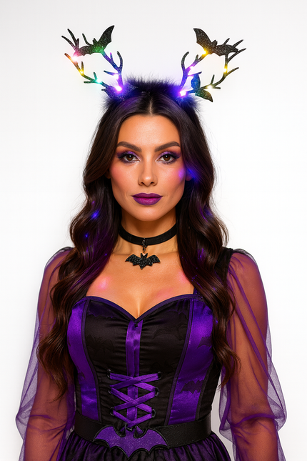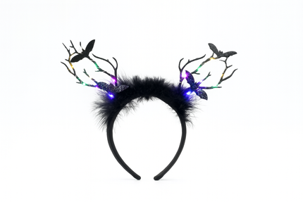 Dieser detailreich gestaltete Halloween-Haarreif verbindet filigrane, schwarze Zweige mit Fledermäusen – dazwischen sorgen mehrfarbige Micro-LEDs für spektakuläre Lichteffekte. Ob zu Hexe, Vampir, Bat-Queen oder Gothic-Look: Der flexible, leichte Haarreif sitzt bequem und setzt dein Outfit im Dunkeln perfekt in Szene.