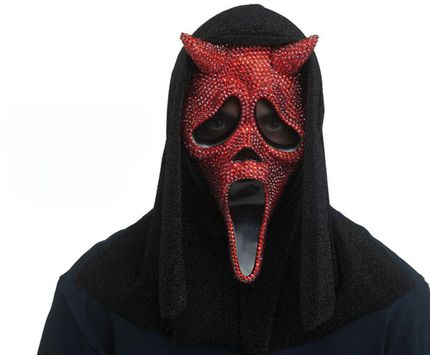 Ghost Face ScreamMaskemit roten Strasssteinen, Teufelshörnern und Kapuze aus schwarzem Glitzerstoff aus dem Spiel Dead by Daylight.