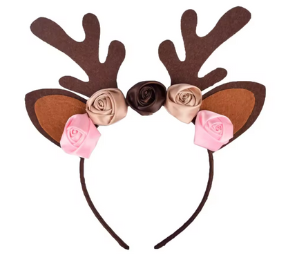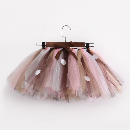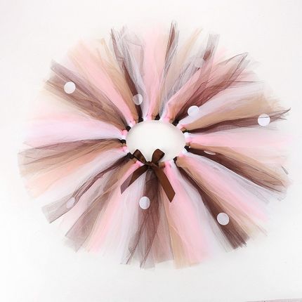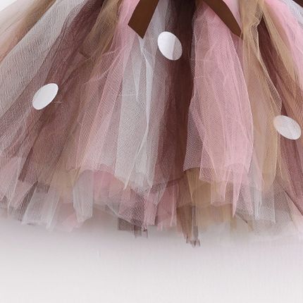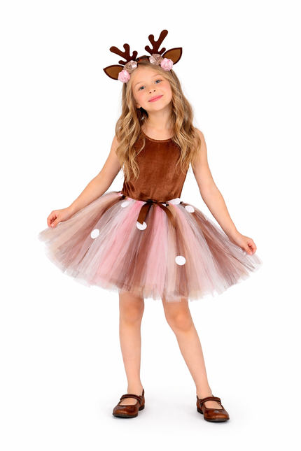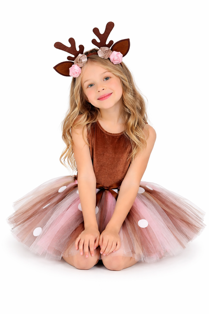 Niedliches Reh Kinderkostümfür Mädchen bestehend aus einem Tüllrock in Braun-, Beige- und Rosatönen mit weißen Punkten sowie einem Haarreif mit Stoffrosen, Geweih und Öhrchen.