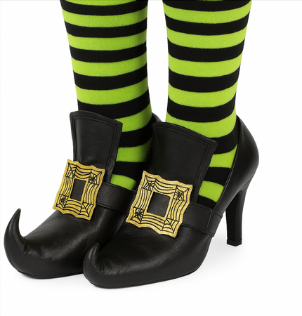 Spitz zulaufende Hexenschuhe sind das Herzstück jeder Witch-Verkleidung. Mit diesen Hexen-Gamaschen als Schuhüberzieher stylst du deine eigenen Pumps im Handumdrehen zu Hexenschuhen um. Die Kunstleder-Überzieher werden einfach übergestülpt und mittels elastischer Bänder an der Schuhspitze fixiert – fertig!