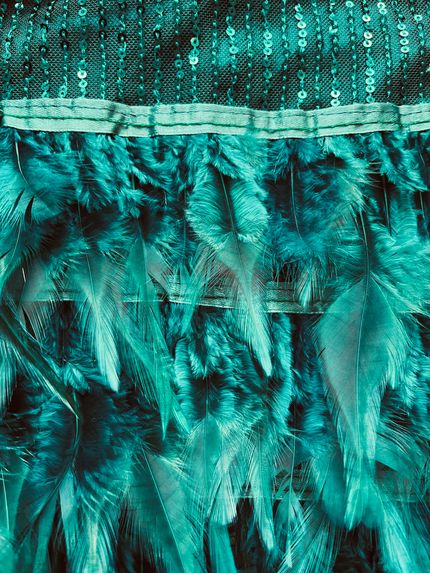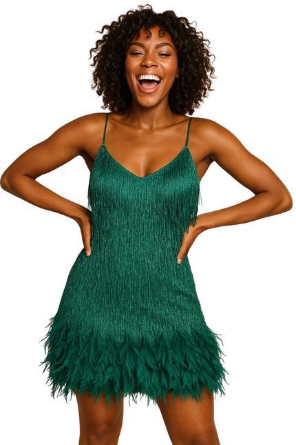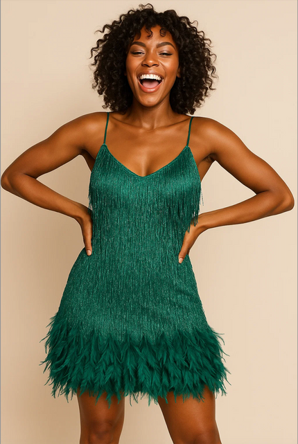 - Pailletten-Minikleid mit langen Fransen und Federn im unteren Rockteil für Verkleidungen als Pfau, Tina Turner oder Charleston-Lady