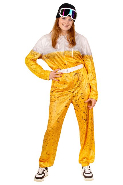 - Skianzug in Bier-Optik für Damen und Herren mit Kapuze, zwei Eingrifftaschen, Gürtel und Kordelzug