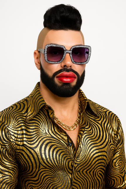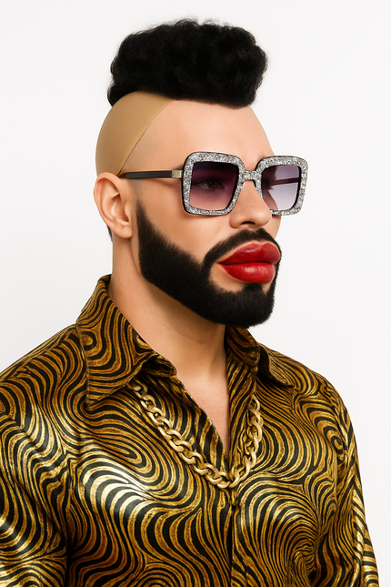 - Lieferumfang: Irokesen-Perücke, Bart, schwarze Sonnenbrille mit Strassrand, dicke Lippen an Gummiband