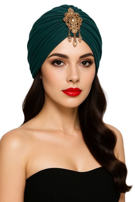 Eleganter Damen-Turban aus elastischem Material mit goldfarbenem Strass-Ornament.
