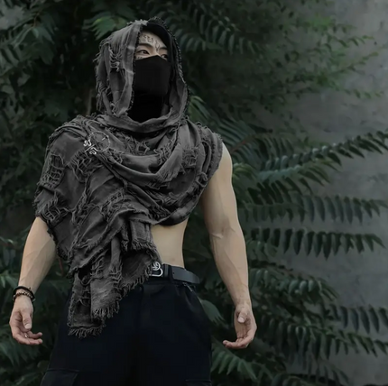 Dunkelgrauer Maxischal im ausgefransten Fetzen-Look mit silberner Metallschnalle.