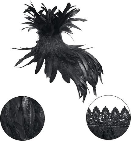 Wunderschöner, asymmetrischer Federkragen mit schwarzer Spitzenborte in vielen intensiven Farben, passend zu exotischen Vogel-Verkleidungen, Gothic-Outfits und Halloween-Kostümen.