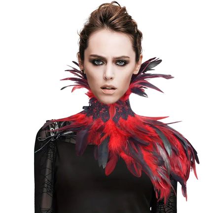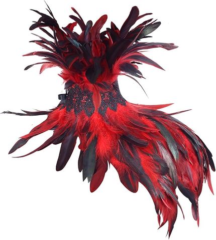 Wunderschöner, asymmetrischer Federkragen mit schwarzer Spitzenborte in vielen intensiven Farben, passend zu exotischen Vogel-Verkleidungen, Gothic-Outfits und Halloween-Kostümen.