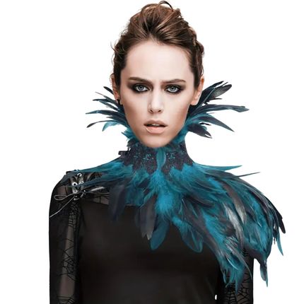 Wunderschöner, asymmetrischer Federkragen mit schwarzer Spitzenborte in vielen intensiven Farben, passend zu exotischen Vogel-Verkleidungen, Gothic-Outfits und Halloween-Kostümen.