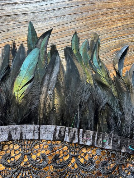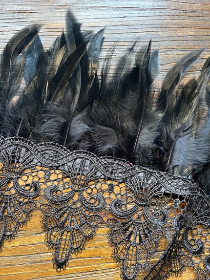 Wunderschöner Federschal mit schwarzer Spitzenborte in vielen intensiven Farben, passend zu exotischen Vogel-Verkleidungen, Gothic-Outfits und Halloween-Kostümen.