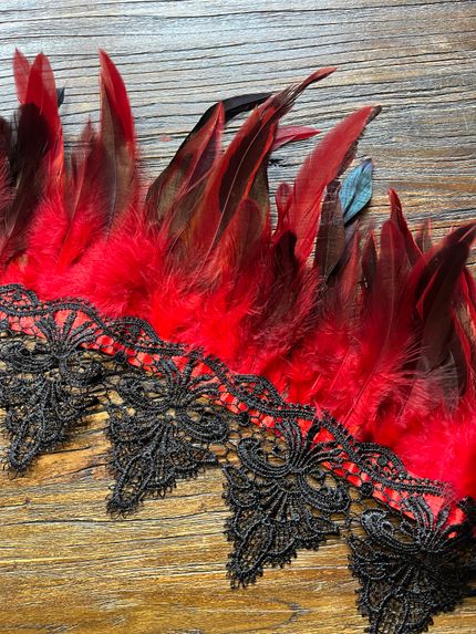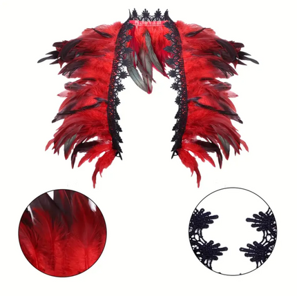 Wunderschöner Federschal mit schwarzer Spitzenborte in vielen intensiven Farben, passend zu exotischen Vogel-Verkleidungen, Gothic-Outfits und Halloween-Kostümen.