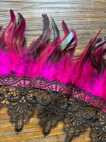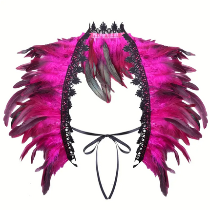 Wunderschöner Federschal mit schwarzer Spitzenborte in vielen intensiven Farben, passend zu exotischen Vogel-Verkleidungen, Gothic-Outfits und Halloween-Kostümen.