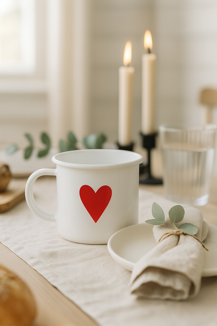 Schlicht, leicht, unkaputtbar: Diese weiße Emaille-Tasse im skandinavischen Landhausstil mit rotem Herz verbindet Retro-Charme mit Alltagstauglichkeit. Perfekt als Bürotasse oder für draußen – vom Frühstück im Garten bis zum Camping & Picknick. Das Herz-Motiv macht sie außerdem zur süßen Geschenkidee für Valentinstag, Geburtstag oder Weihnachten.