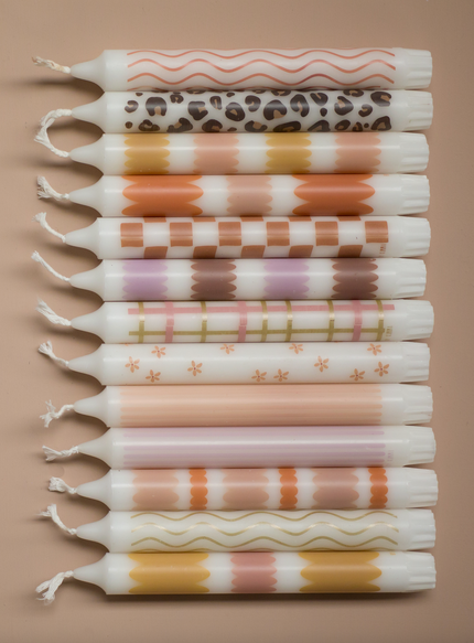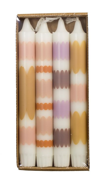 4 Dinnerkerzen mit hübschem Flower Power Design im Stil der 70er Jahre.