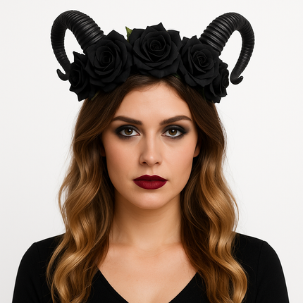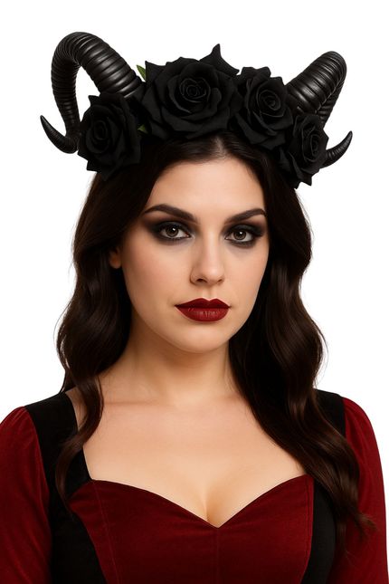 - Starker Gothic-Look: Zweigeteilte, gerippte Hörner und eine Krone aus schwarzen Rosen ergeben einen dramatischen Eyecatcher – perfekt für Dark Angel, Dämonin, Hexe & Co.