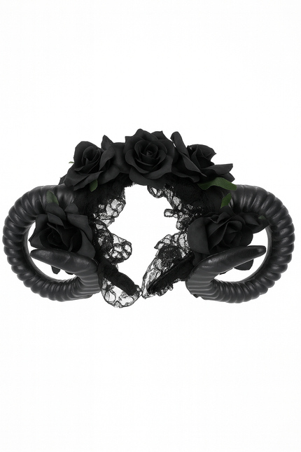 Satanisches Horn - Gothic Kopfschmuck mit Widderhorn, Rosen und Spitze Schwarz
