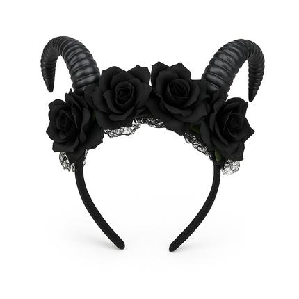 Dieser aufwendig gestaltete Gothic-Haarreif vereint diabolische Hörner mit einer Blütenkrone aus schwarzen Rosen und zarter Spitze – die perfekte Mischung aus düster und edel. Die geschwungenen, gerippten Widder-Hörner setzen eine markante Silhouette, während Rosen und Blätter dem Diadem eine elegante und romantische Note verleihen.
